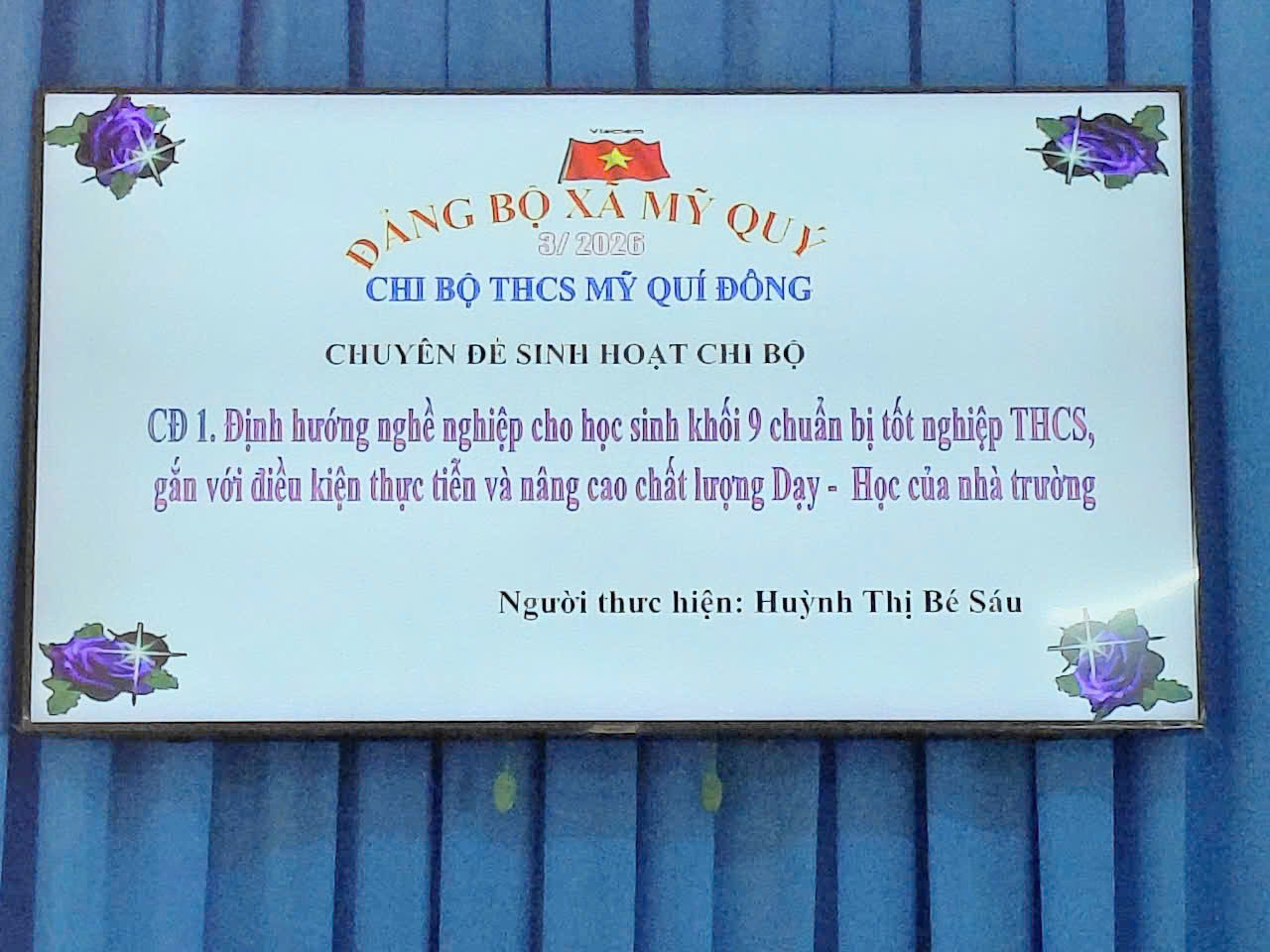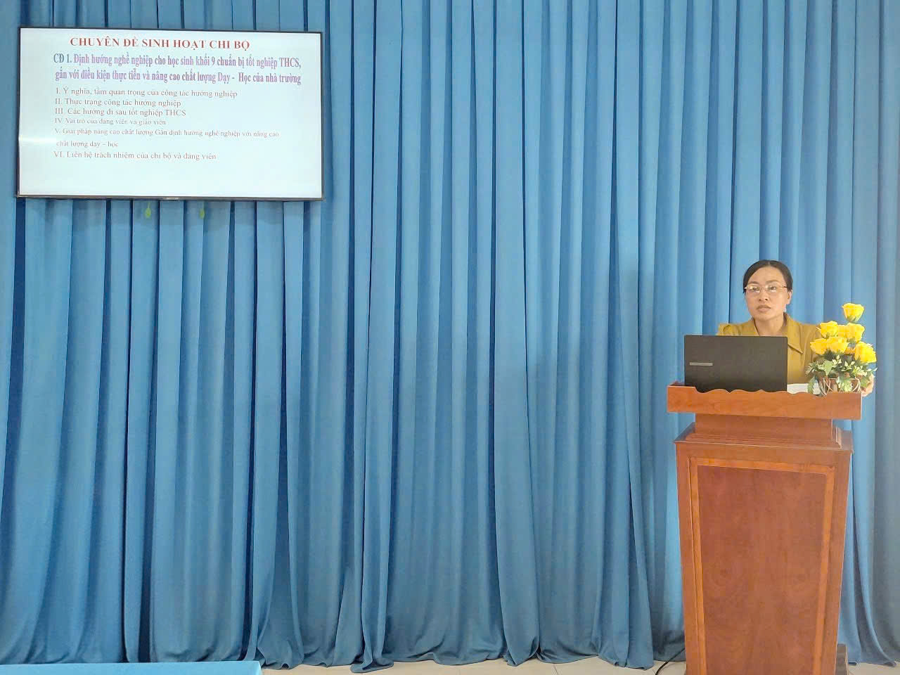 Bên cạnh tổ chức sinh hoạt chi bộ trong tháng 3 thì trong cuộc họp còn lồng ghép thực hiện chuyên đề ở Quý I, do đồng chí Huỳnh Thị Bé Sáu thực hiện với “Chuyên đề 1. Định hướng nghề nghiệp cho học sinh khối 9 chuẩn bị tốt nghiệp THCS, gắn với điều kiện thực tiễn và nâng cao chất lượng dạy – học của nhà trường.”